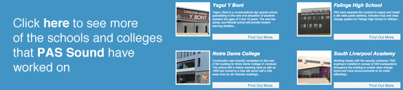 From Primary schools to Universities and Colleges, PAS have supplied and installed sound systems to all levels of the education sector. Offering a complete design and installation service or just a single component, we can ensure that any audio requirement is met cost effectively and promptly. The recently published 'Building Bulletin 93 - Section 1' sets the Department for Education and Skills (DfES) legislative standards for the acoustics of new school buildings. "The overall objective of the performance standards in Section1.1 (of BB93) is to provide acoustic conditions in schools that facilitate clear communication of speech between teacher and student and do not interfere with study activities" |