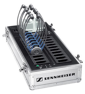 The EZL 2020-20L charger case has been designed to be highly user-friendly. It acts as both the storage case for all equipment and charging station for the TourGuide receivers and transmitter. Twenty charging bays for the receivers and two charging bays for the transmitter-or its rechargeable battery pack-are provided.